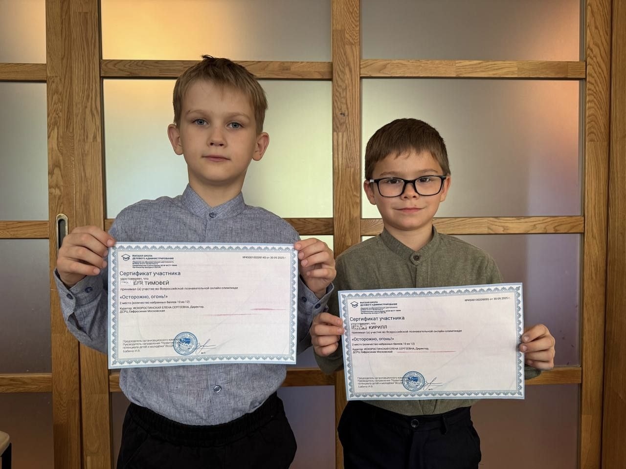 Наши парни,Кирилл и Тимофей, приняли участие в онлайн-олимпиаде «Осторожно, огонь!». Знания о пожарной безопасности очень важны, чтобы в экстренной ситуации не испугаться, а правильно среагировать.
